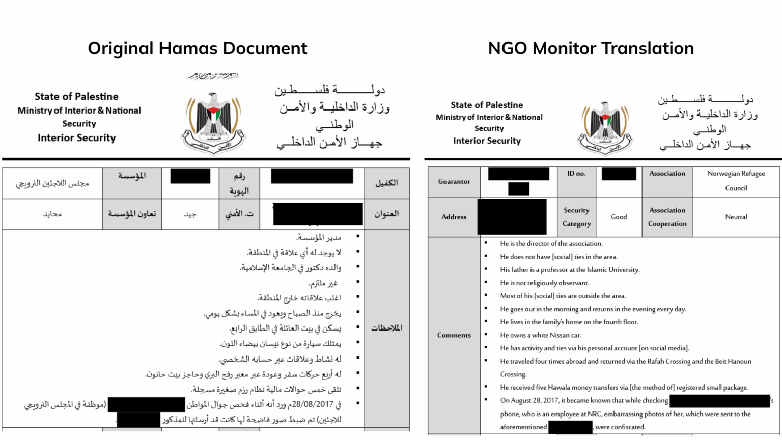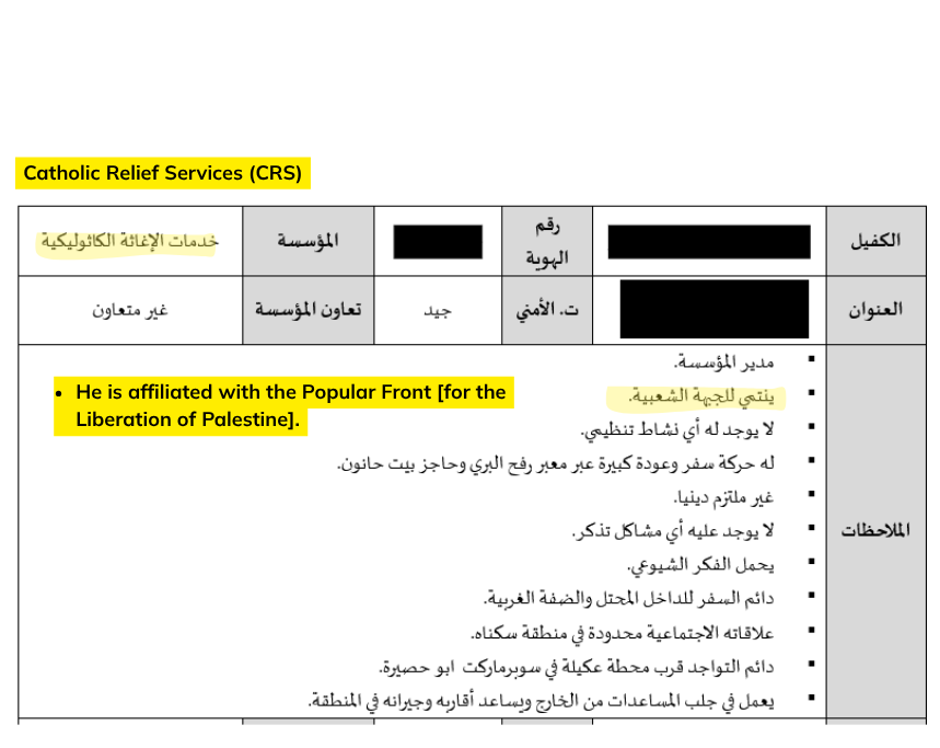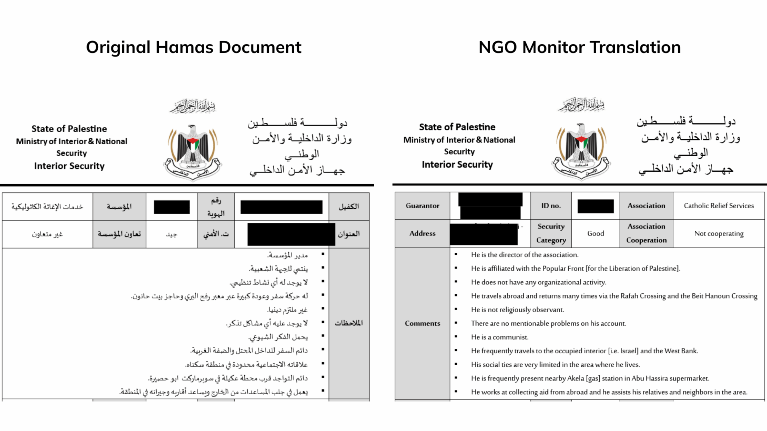 Zusätzlich ist der Garant von Catholic Relief Services (CRS) mit der Popular Front for the Liberation of Palestine (PFLP) affiliiert, die von USA, EU und Kanada als Terrororganisation eingestuft ist. Die Garanten werden als Intelligence-Quellen genutzt, mit gesammelten persönlichen Daten wie Beziehungen, Korrespondenzen, Hintergründen, religiöser Observanz, politischen Affiliationen und Strafregistern. Beispiele aus Berichten: „Sie verlässt ihr Haus in enthüllender Kleidung, die gegen die Scharia verstößt“; „Er ist moralisch verdächtig aufgrund einer unmoralischen Beziehung zu einer weiblichen Mitarbeiterin“; „Am 28. August 2017 wurden peinliche Fotos vom Telefon eines NRC-Mitarbeiters konfisziert“; „Sie hat eine sehr starke Persönlichkeit und ist nicht anfällig für Druck und Erpressung“; „Er hasst die Hamas-Bewegung“; „Er ist Kommunist“. Ein Memo vom 15. Juni 2020 markiert den Medienleiter von Oxfam jüdischer Herkunft als „Bedrohung“. Analysten wie NGO Monitor kommen zu dem Schluss, dass eine wirksame Überwachung der Region ohne die Untersuchung der Hamas Kontrolle über NGOs kaum möglich wäre.